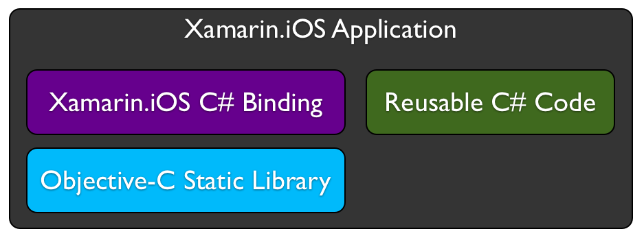 Additionally, Xamarin allows you to leverage existing Objective-C assets via a technology know as bindings. You simply create a static library in Objective-C and expose it to C# via a binding, as illustrated in the following diagram: