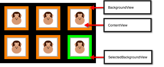 The Cells in the screenshot above are created by inheriting from UICollectionViewCell and setting the ContentView, SelectedBackgroundView and BackgroundView properties,