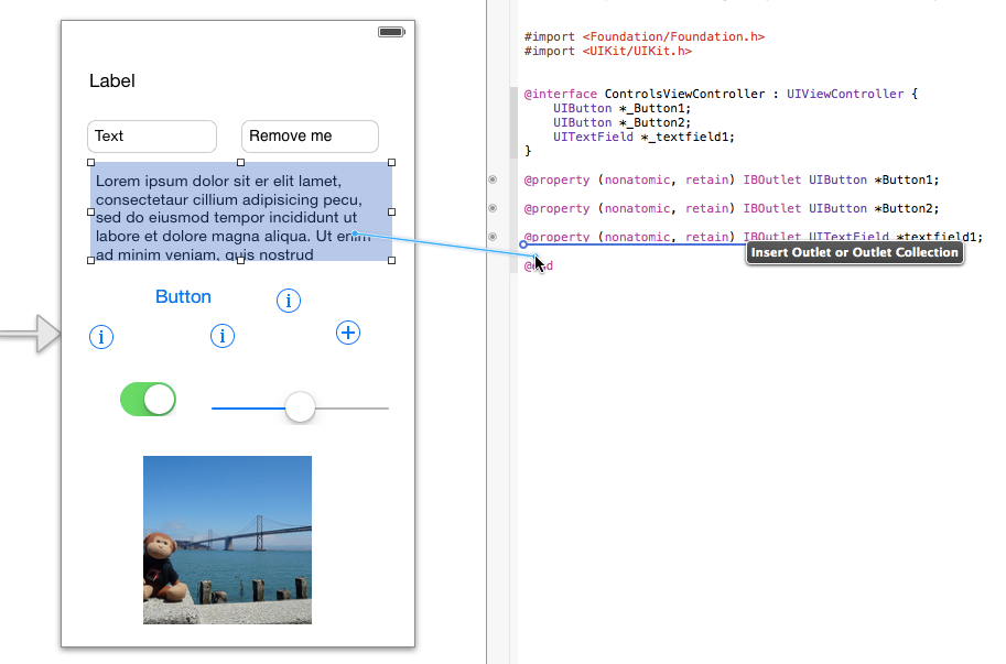 Click on a user interface object; then Control Drag into the .h file. To Control Drag, hold down the