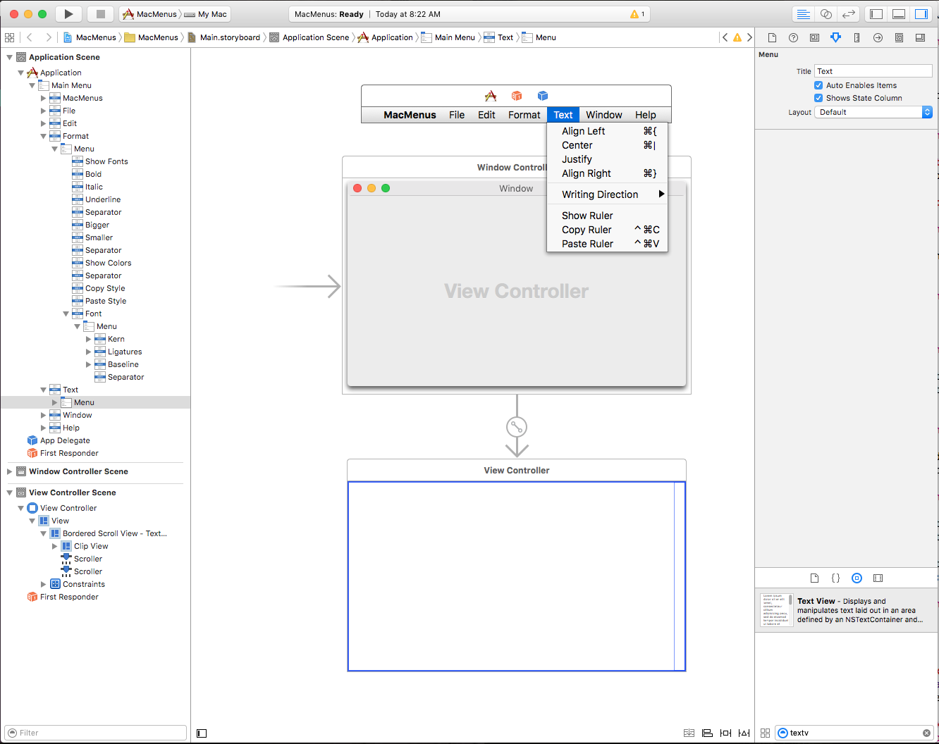 NSMenucan find an appropriate object that responds to the action that the item is wired-up to. For example, the text view above that had a built-in hook to thecopy:action. - Custom actions and validateMenuItem: - For any menu item that is bound to a window or view controller custom action, you can add the