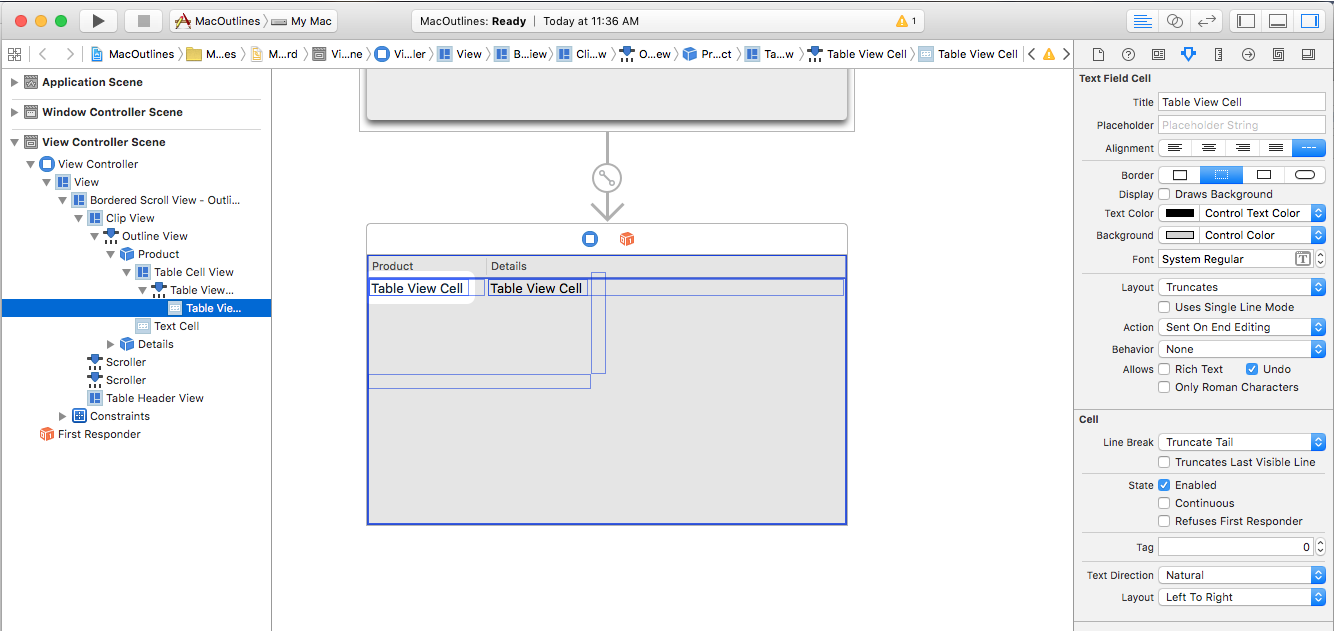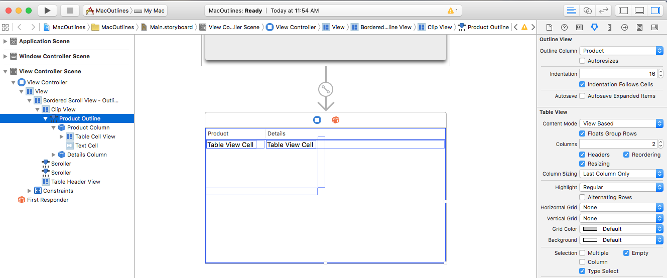 Let's allow the user to sort the data in the outline by clicking on a Column Header. First, double-click the Main.storyboard file to open it for editing in Interface Builder. Select the Product column, enter Title for the Sort Key, compare: for the Selector and select Ascending for the Order: