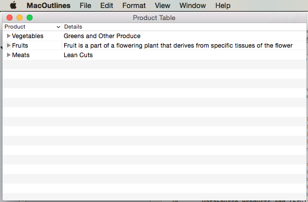An Outline View is a type of Table that allows the user expand or collapse rows of hierarchical data. Like a Table View, an Outline View displays data for a set of related items, with rows representing individual items and columns representing the attributes of those items. Unlike a Table View, items in an Outline View are not in a flat list, they are organized in a hierarchy, like files and folders on a hard drive.