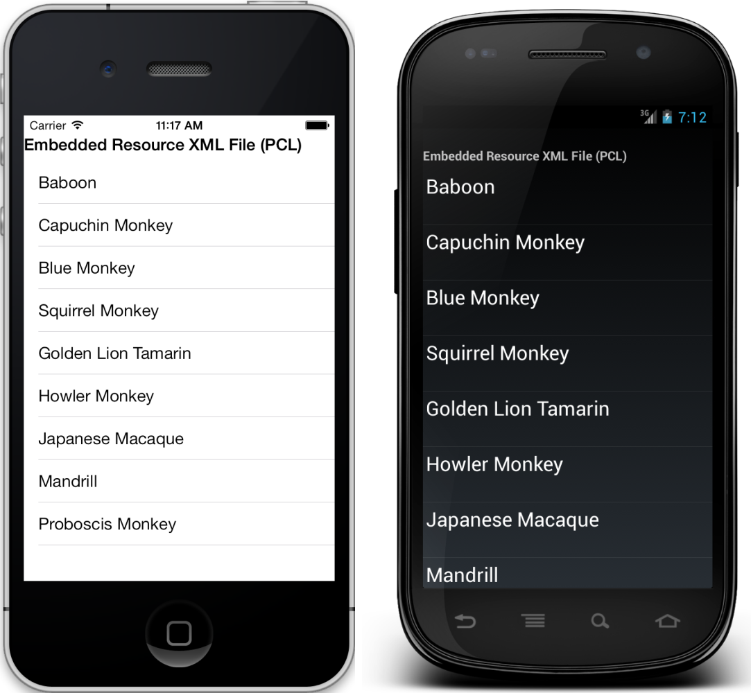 Loading and deserializing an XML is equally simple. The following code shows an XML file being loaded and deserialized from a resource, then bound to a ListView for display. The XML file contains an array of Monkey objects (the class is defined in the sample code).