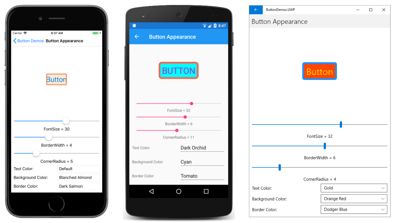 Each platform renders the Button in its own specific manner. In the Button appearance section, you'll see how to set colors and make the Button border visible for more customized appearances. Button implements the IFontElement interface, so it includes FontFamily, FontSize, and FontAttributes properties.