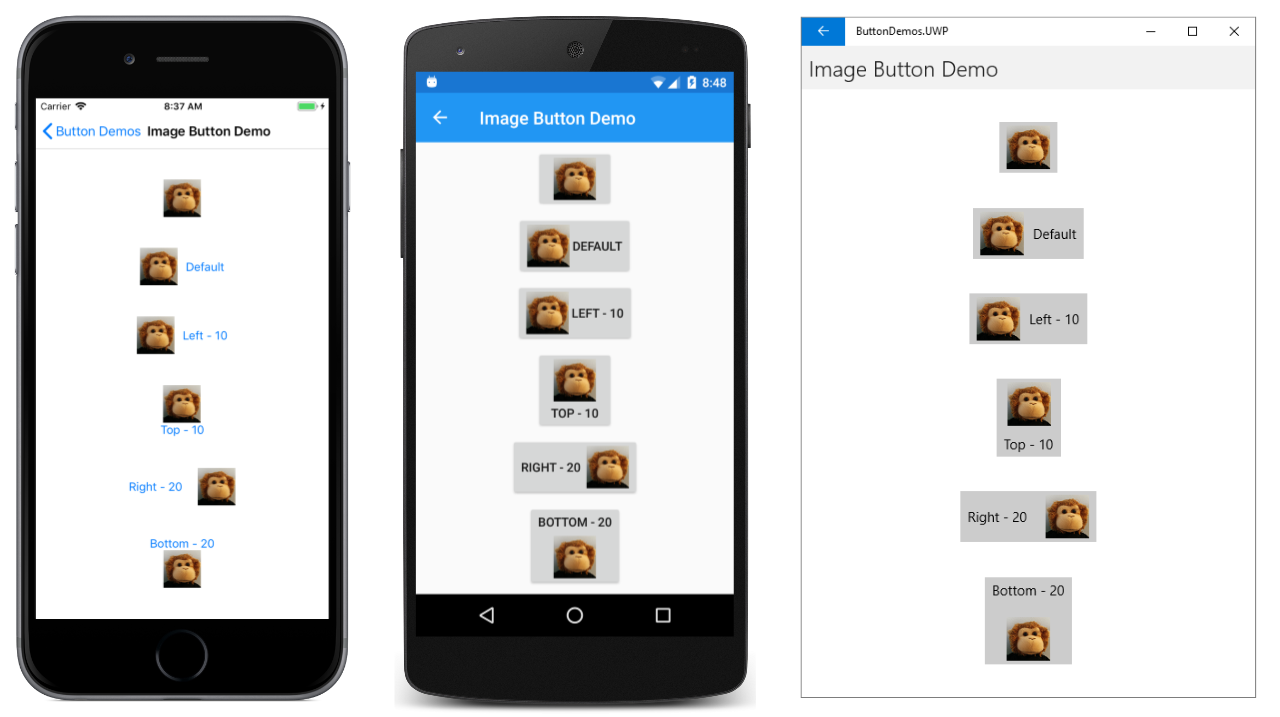 The final four Button elements make use of the ContentLayout property to specify a position and spacing of the text and bitmap: