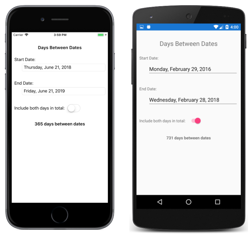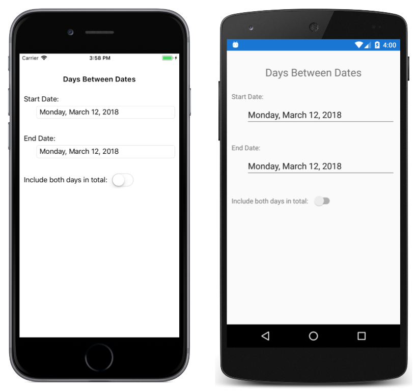When the sample is first run, both DatePicker views are initialized to today's date. The following screenshot shows the program running on iOS and Android: