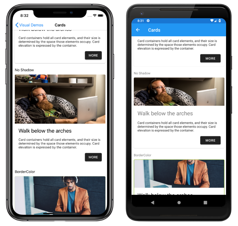 Xamarin.Forms Material Visual can be used to apply Material Design rules to Xamarin.Forms applications, creating applications that look largely identical on iOS and Android. When Material Visual is enabled, supported views adopt the same design cross-platform, creating a unified look and feel.