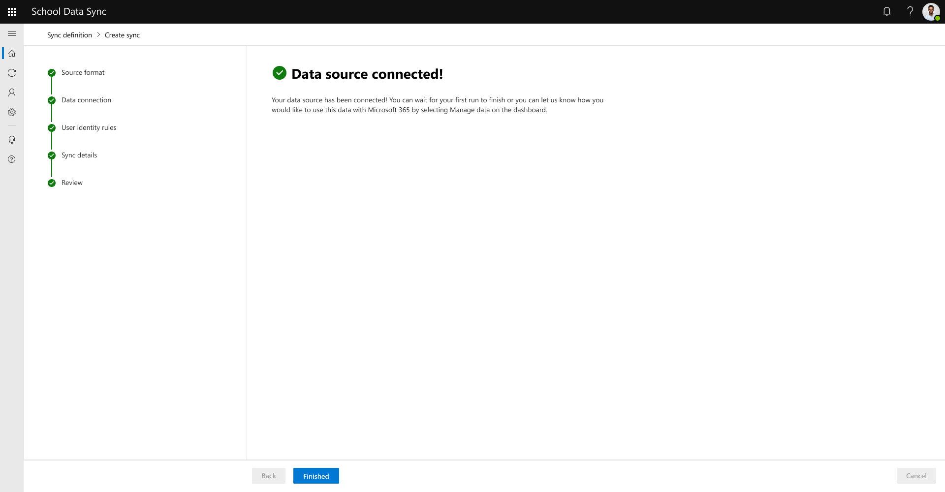 Your connect data configuration is created, and the first run is pending, select Finished button.