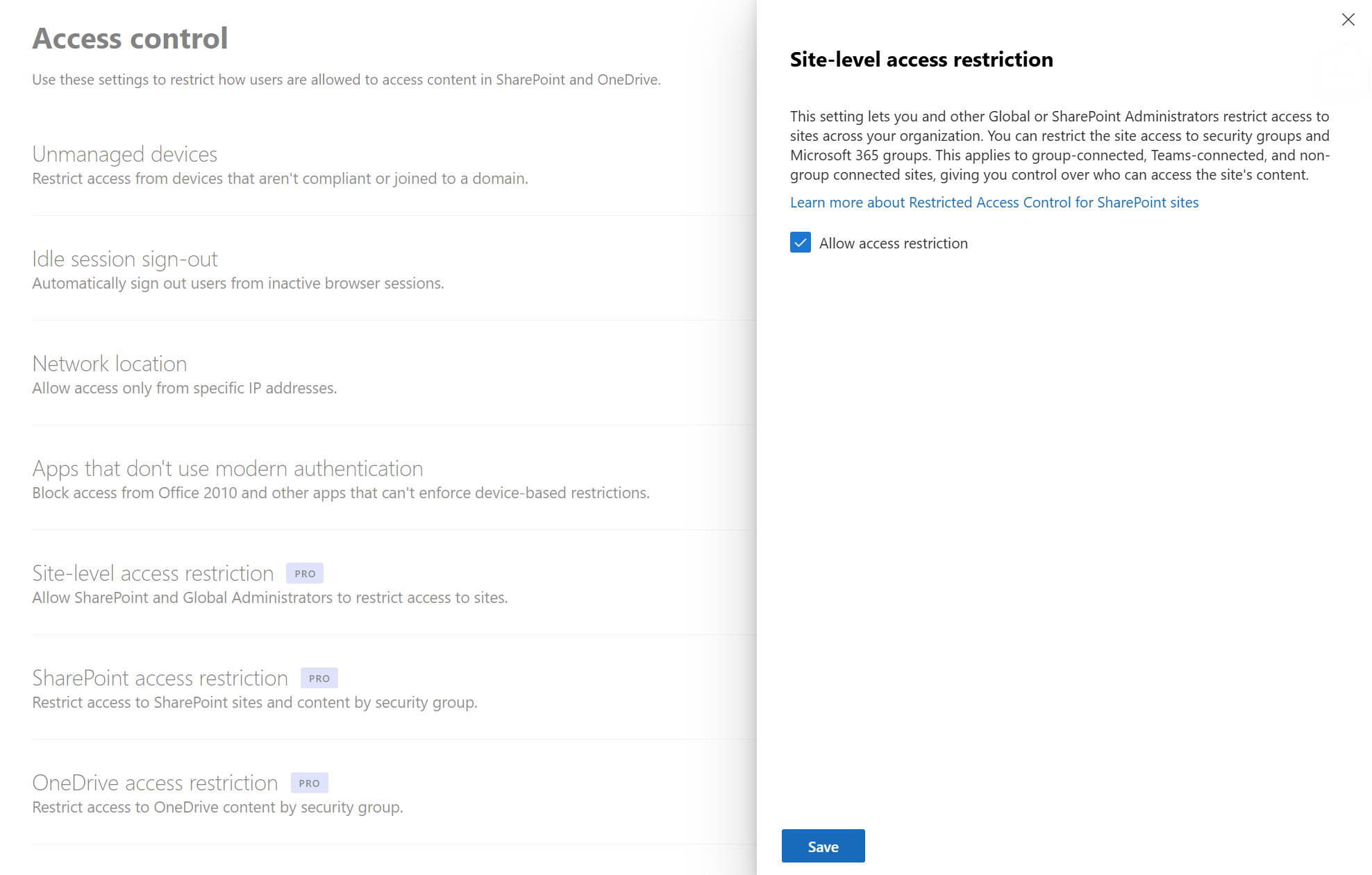 To enable site-level access restriction for your organization in SharePoint admin center: