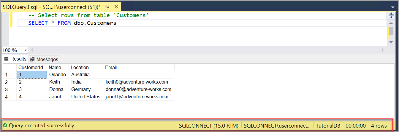 Now let's insert some rows into the Customers table that you created. Paste the following T-SQL code snippet into the query window, and then select Execute: