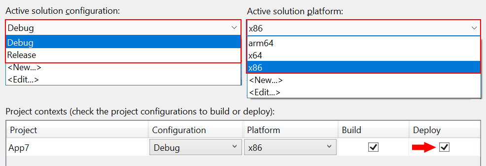 - In Configuration Manager, click the Deploy check box for every combination of configuration and platform (for example, Debug and x86, Debug and arm64, Release and x64, and more).