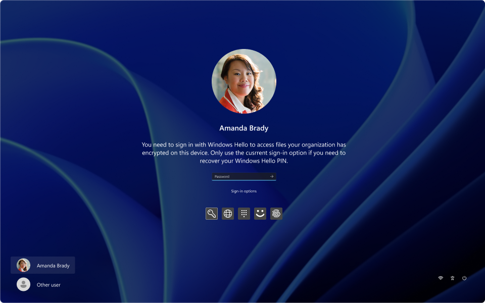 - If a user attempts to sign in without Windows Hello, a message appears on the sign in screen indicating that to access encrypted content the user must sign in with Windows Hello