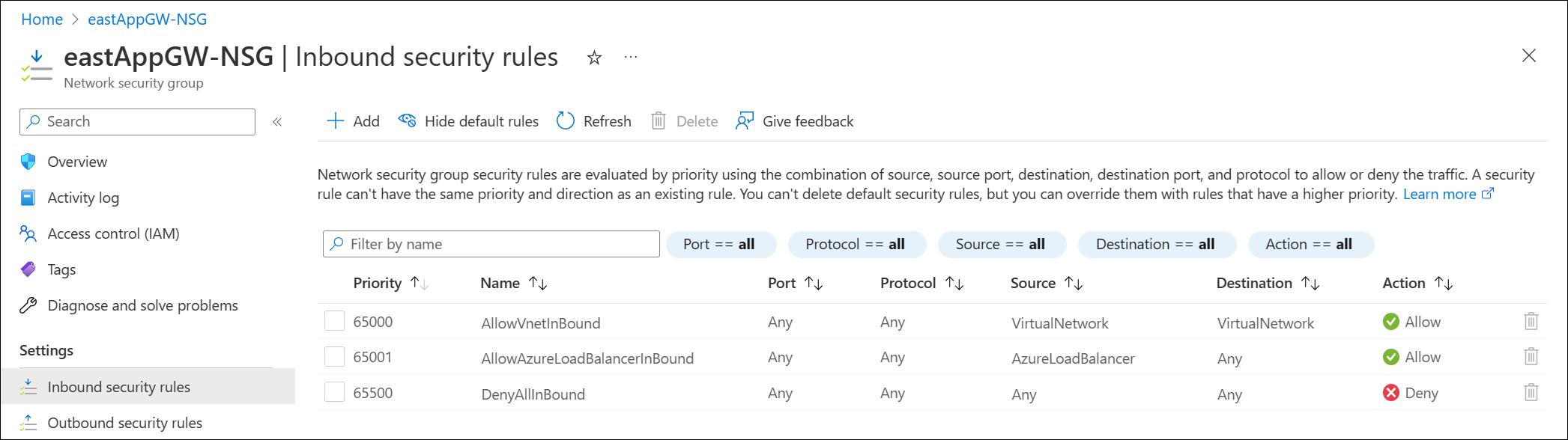 The following configuration is an example of the most restrictive set of inbound rules, denying all traffic but Azure health probes. In addition to the defined rules, explicit rules are defined to allow client traffic to reach the listener of the gateway.