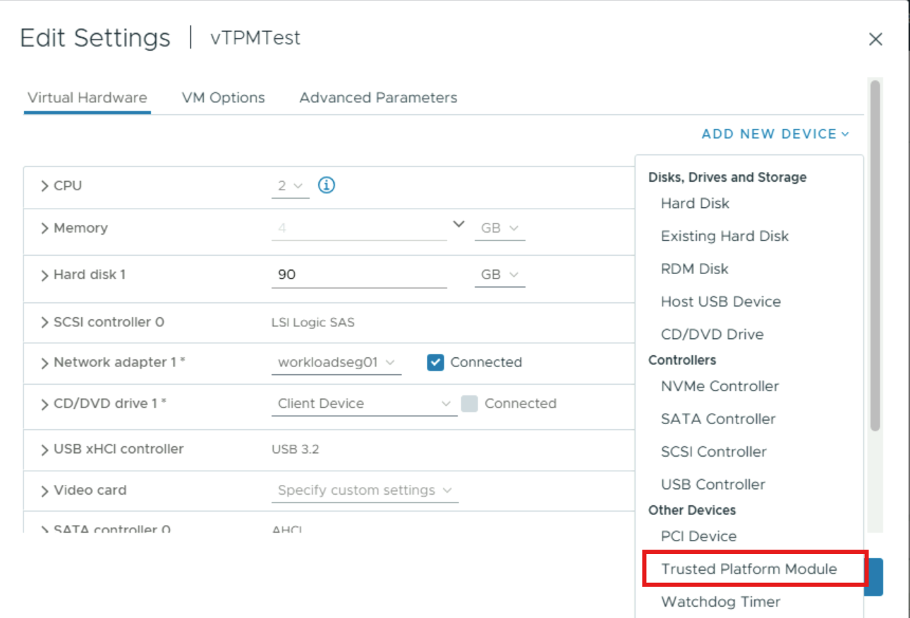 In the Edit Settings dialog box, select Add New Device and choose Trusted Platform Module.