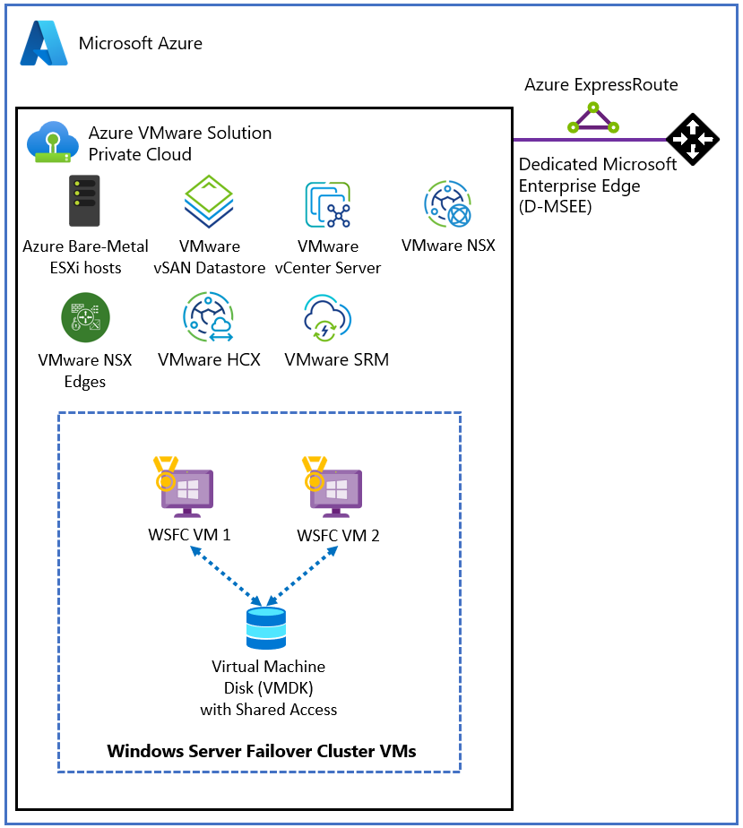 Azure VMware Solution provides native support for virtualized WSFC. It supports SCSI-3 Persistent Reservations (SCSI3PR) on a virtual disk level. WSFC requires this support to arbitrate access to a shared disk between nodes. Support of SCSI3PRs enables configuration of WSFC with a disk resource shared between VMs natively on vSAN datastores.