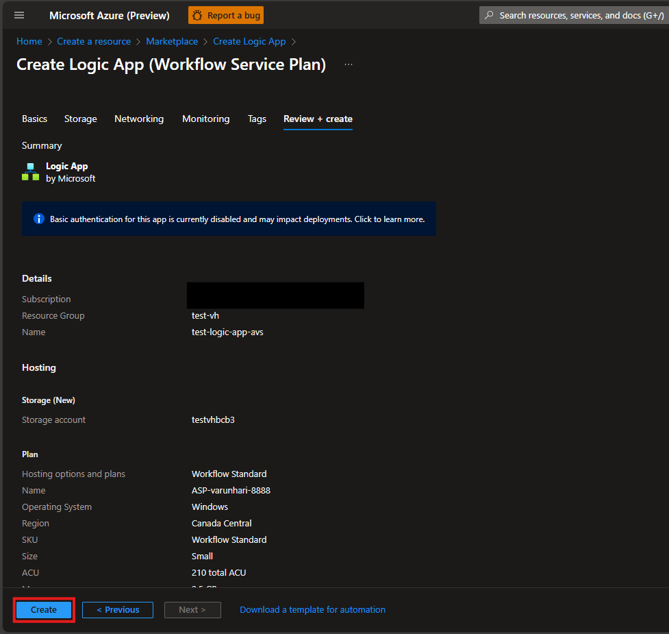 - Enter the Subscription you intend to use, the Resource Group chosen to house this instance. Give it a name and select a region. If your log management server is hosted in Azure—including within your Azure VMware Solution private cloud—ensure you select the same region as the Azure Virtual Network connected to your log management server. Otherwise, the integration will fail. The default Windows plan is Workflow Standard WS1 (210 total ACU, 3.5 Gb memory, 1 vCPU) which should be enough to handle log volumes from large workloads. This option can always be adjusted later, as needed. After filing these details, select Review + create.