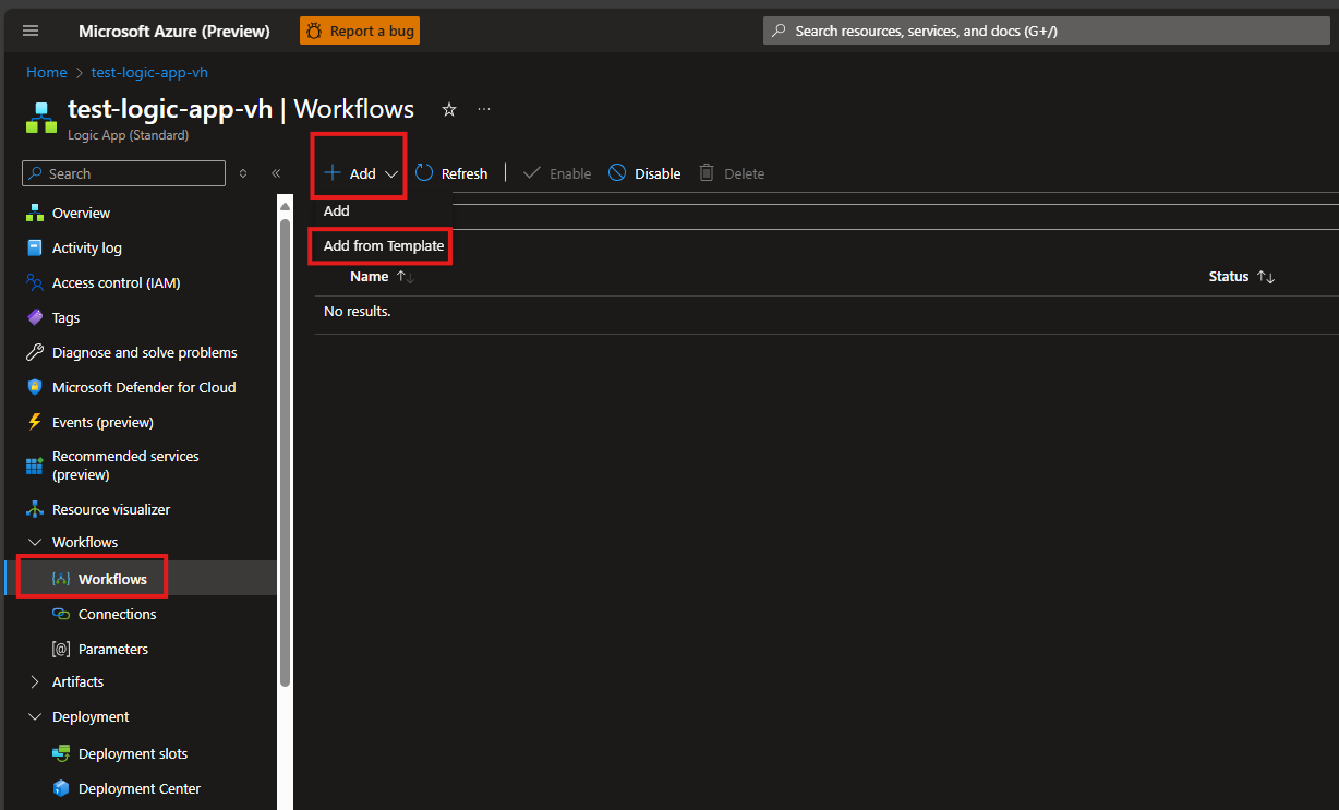 - Once deployed, navigate to the Logic App instance. Select Workflows, then click on Workflows. Select Add, then click on Add from Template. This action takes you to the template catalog available in Azure Logic Apps.