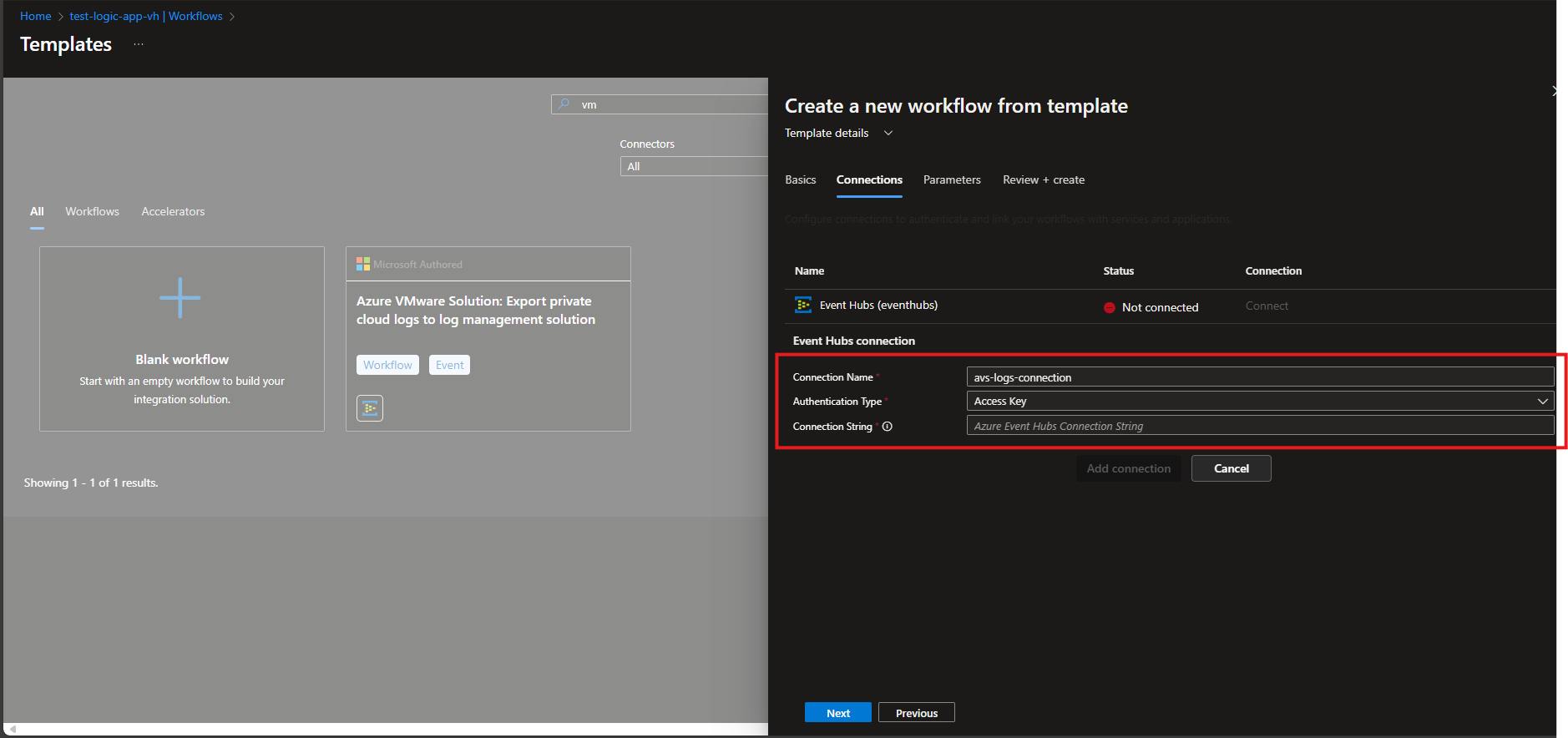 - Next, connect the Event Hub that houses the Azure VMware Solution logs to this Logic App instance. To do so, click Connect. Provide a name for Connection Name, Authentication Type will remain Access Key. For Connection String, you need to retrieve the Connection String from the Event Hub instance you intend to use.