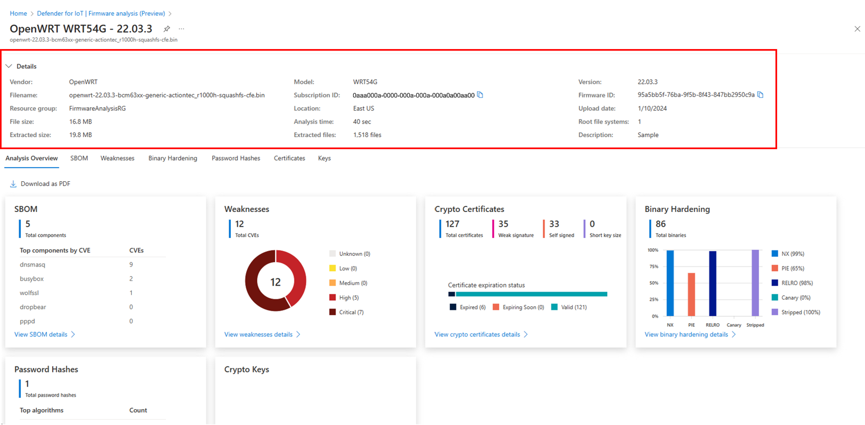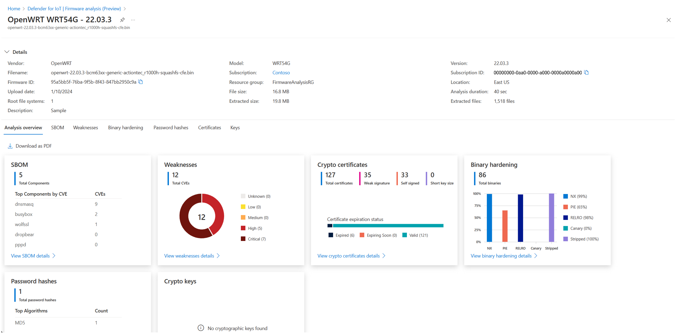 Microsoft Defender for IoT Firmware Analysis is now available in public preview. Defender for IoT can analyze your device firmware for common weaknesses and vulnerabilities, and provide insight into your firmware security. This analysis is useful whether you build the firmware in-house or receive firmware from your supply chain.