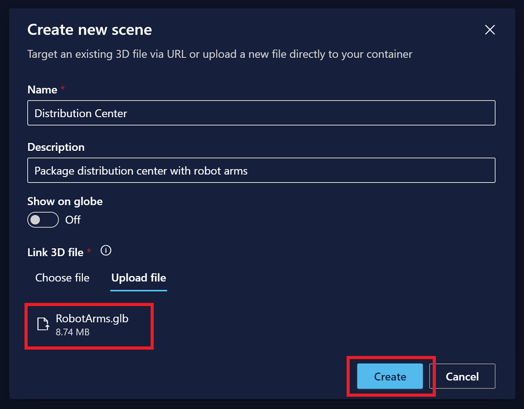Browse for the RobotArms.glb file on your computer and open it. Select Create.