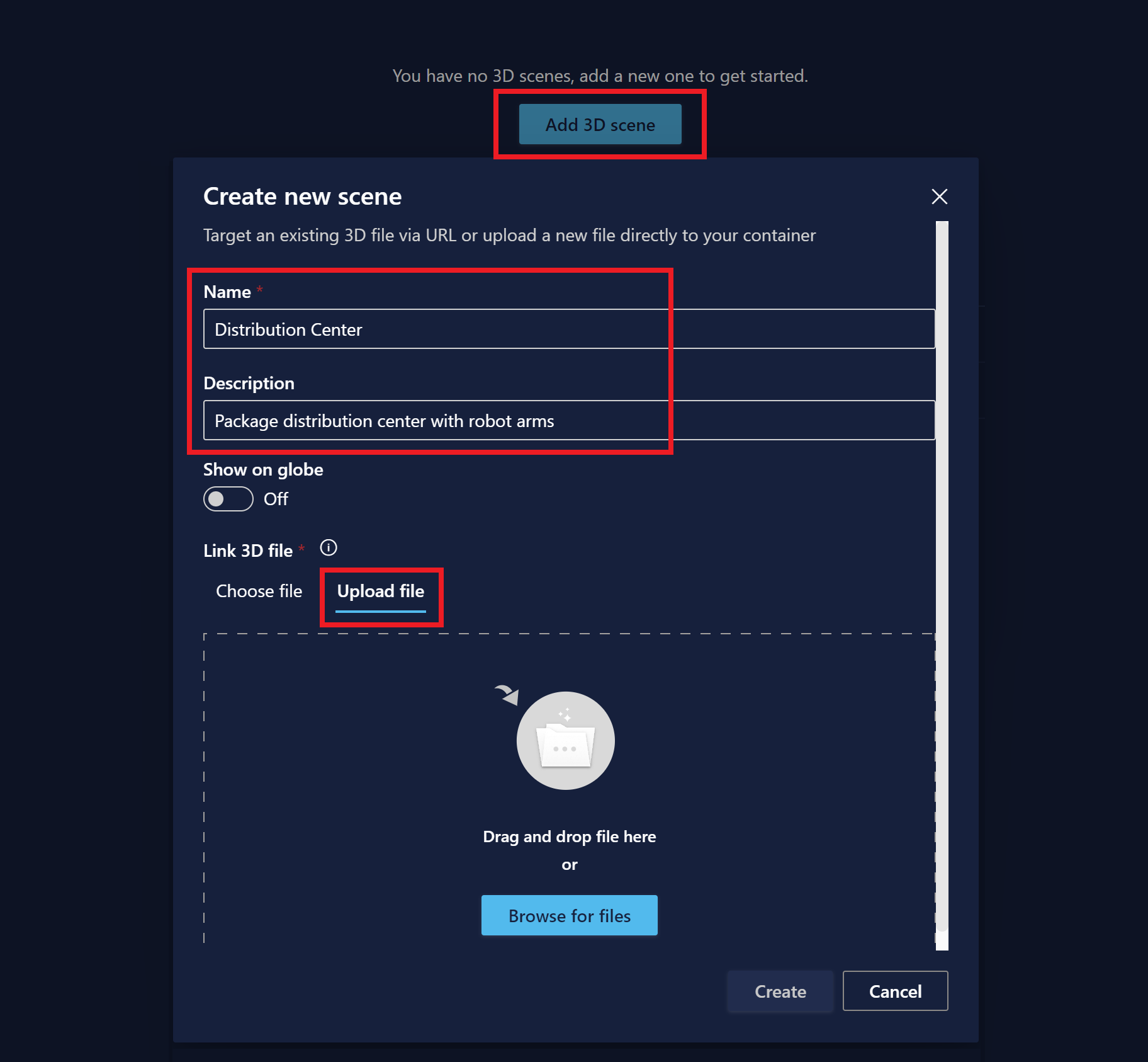 Select the Add 3D scene button to start creating a new scene. Enter a Name and Description for your scene, and select Upload file.