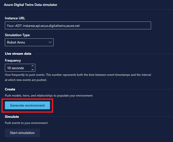In this section, you use the Azure Digital Twins data simulator tool to generate sample models and twins to populate your instance. Then, you use the simulator to stream sample data to the twins in the graph.