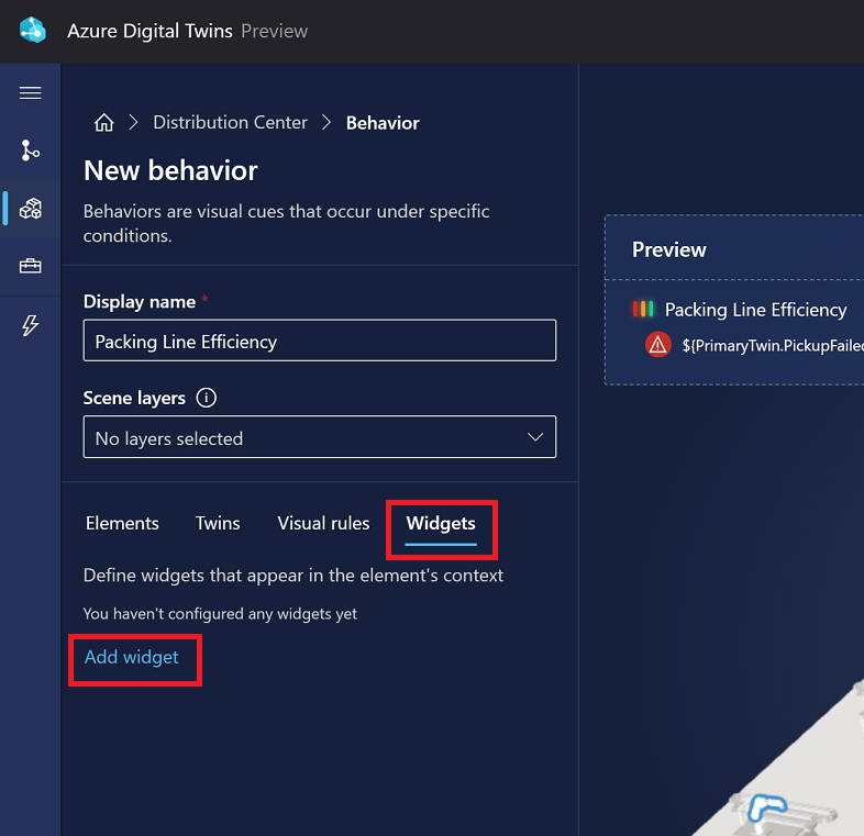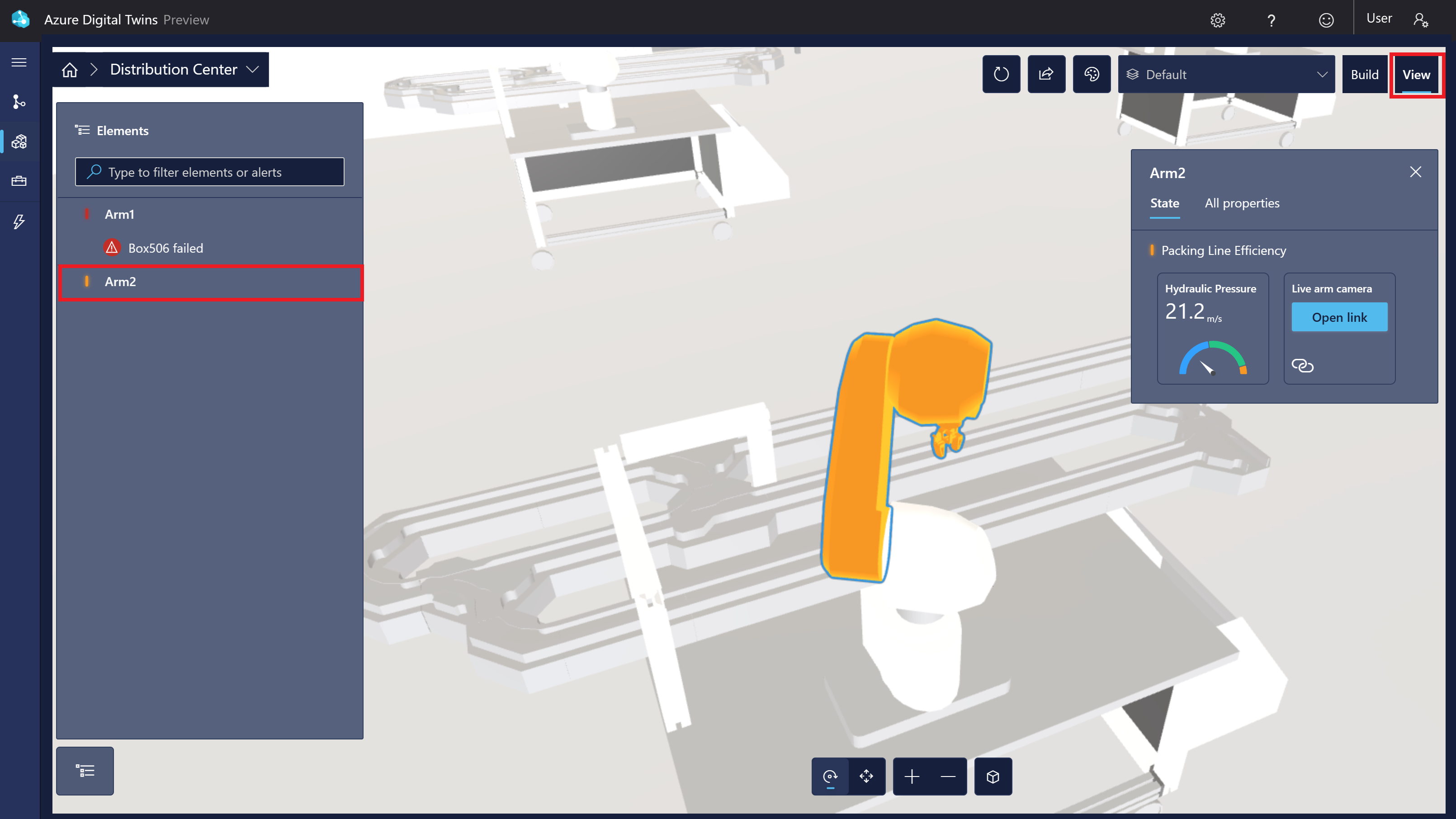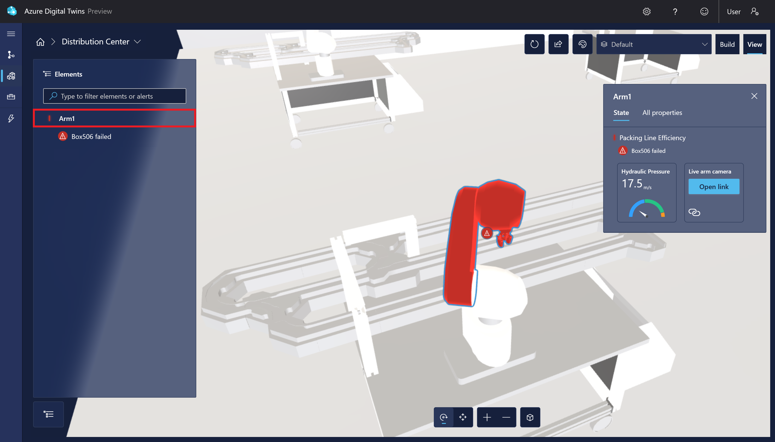In the quickstart, you created a sample 3D scene to represent a package distribution center with robotic arms that pick up packages. This visualization was connected to a digital twin graph, and you linked an arm in the visualization to its own specific digital twin that supplied backing data. You also created a visual behavior to display key information about that arm when viewing the full scene, including information about any boxes the arm failed to pick up within the last hour.
