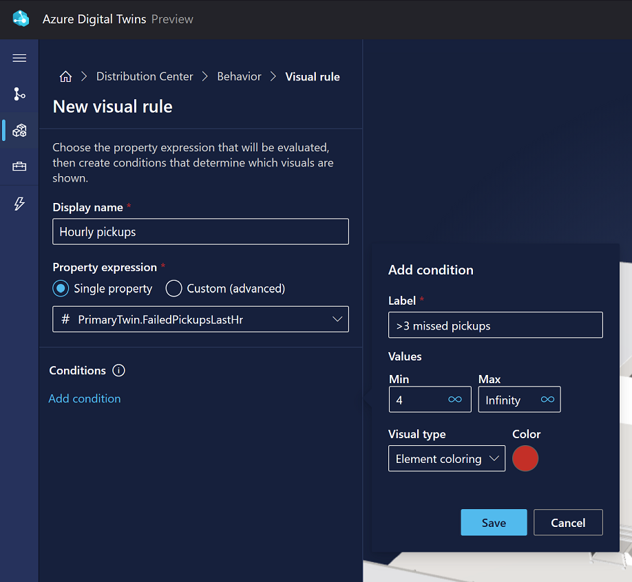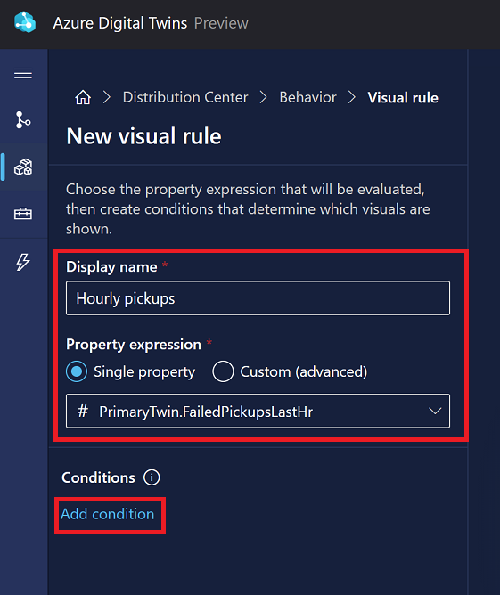 Enter a Display name of Hourly pickups. Leave the Property expression on Single property and open the property dropdown list. It contains names of all the properties on the primary twin for the Arm1 element. Select PrimaryTwin.FailedPickupsLastHr. Then, select Add condition.
