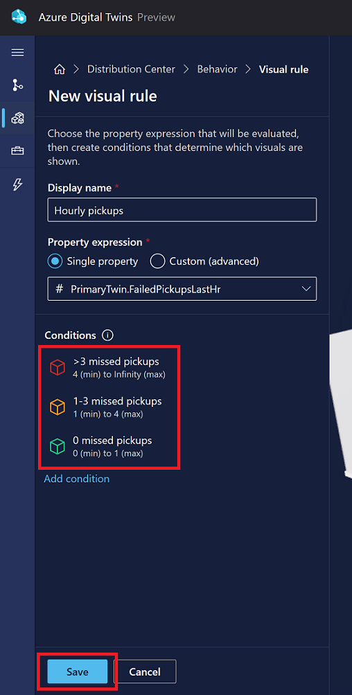Next, you define some boundaries to indicate when the hourly pickups are missing too many packages. For this scenario, let's say an arm needs attention if it misses more than three pickups in an hour. Label the condition >3 missed pickups, and define a value range between 4 and Infinity (the min range value is inclusive, and the max value is exclusive). Assign an Element coloring of red. Select Save.
