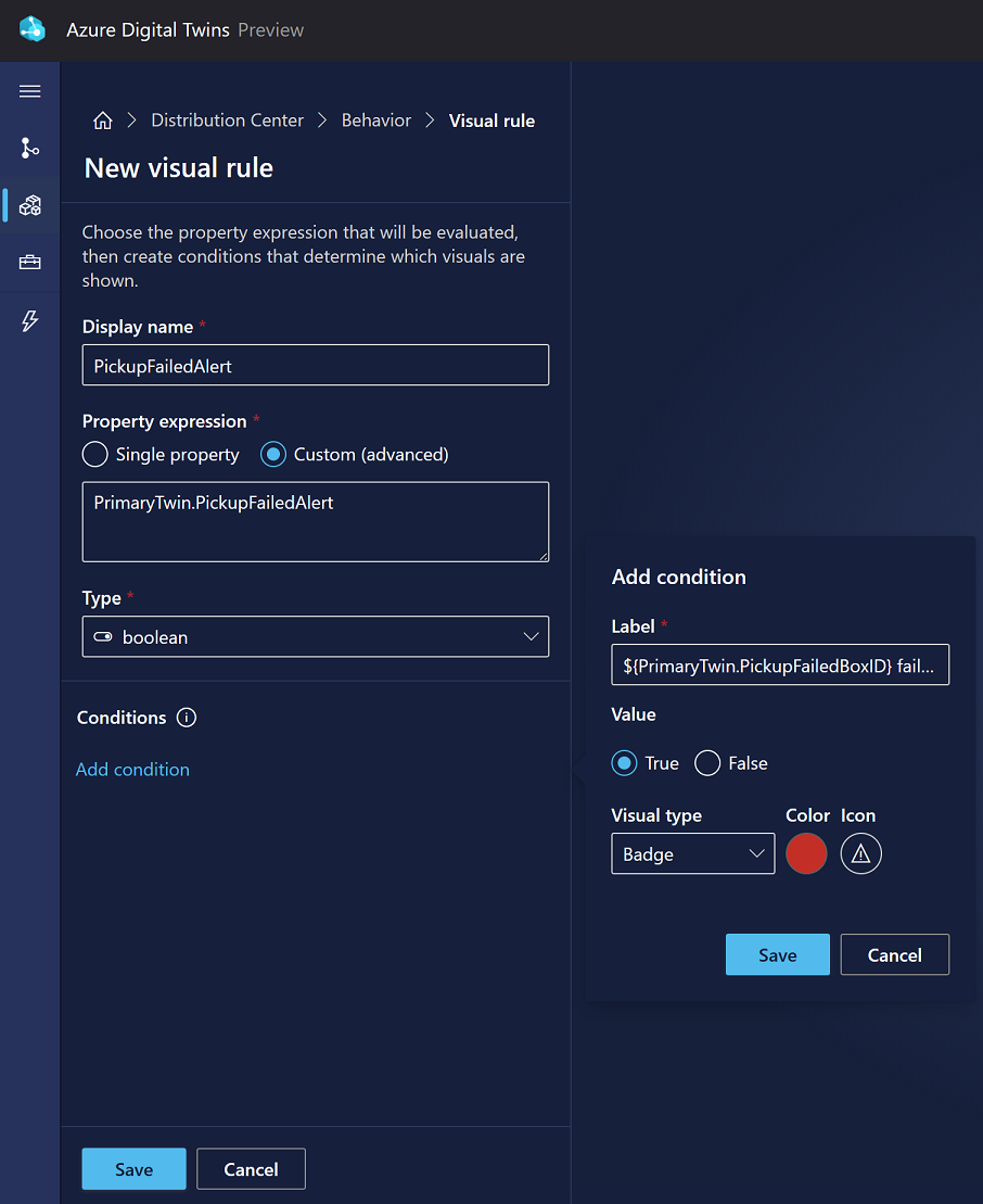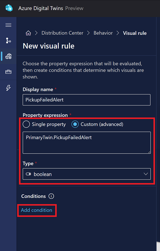 Enter a Display name of PickupFailedAlert. Change the Property expression to Custom (advanced), enter a property of PrimaryTwin.PickupFailedAlert, and set the Type to boolean. This property selection references a boolean property on the arm twin that is set to True when a package pickup fails. Select Add condition.