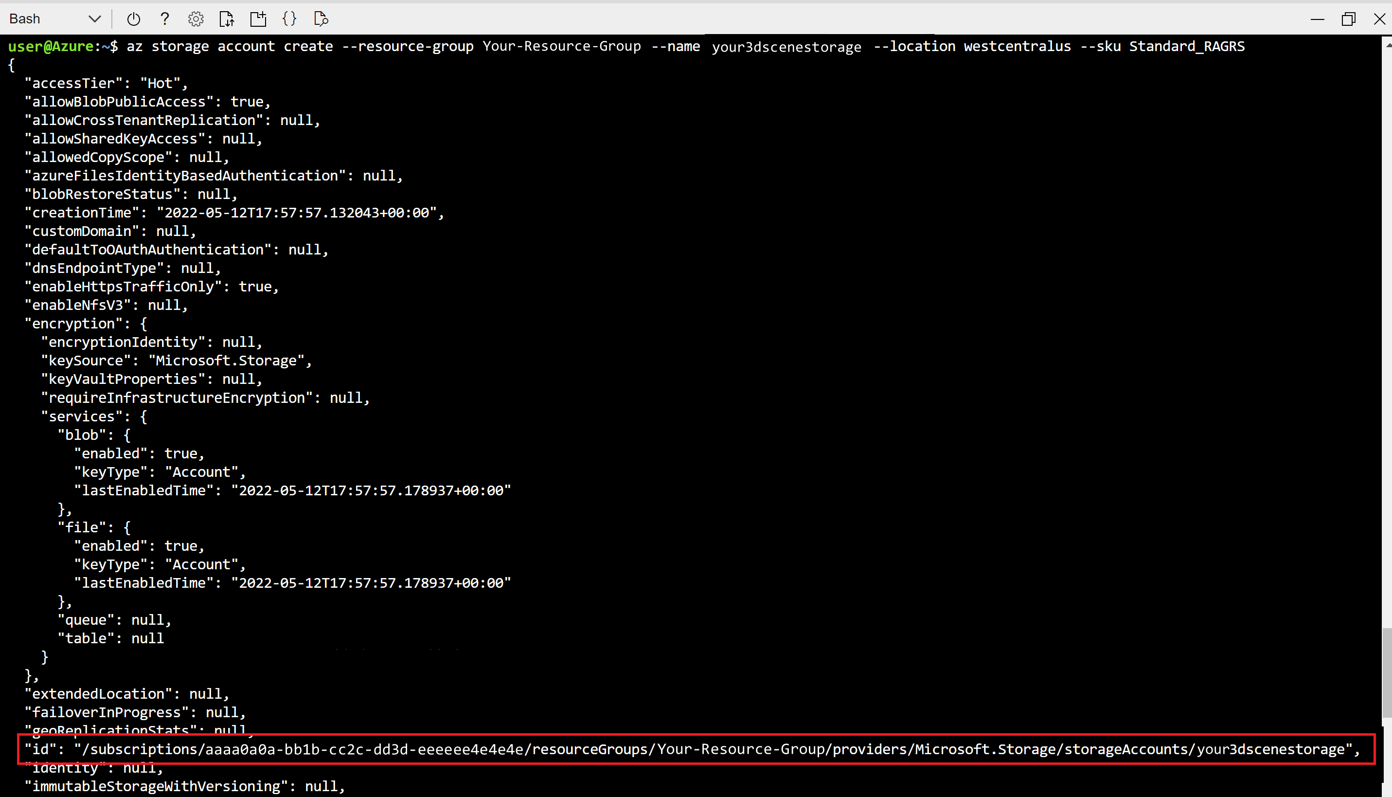 IDvalue in the output and copy it to use in the next command.Run the following command to grant yourself the Storage Blob Data Owner on the storage account. This level of access allows you to perform both read and write operations in 3D Scenes Studio. The command contains placeholders for the email associated with your Azure account and the ID of your storage account that you copied in the previous step.