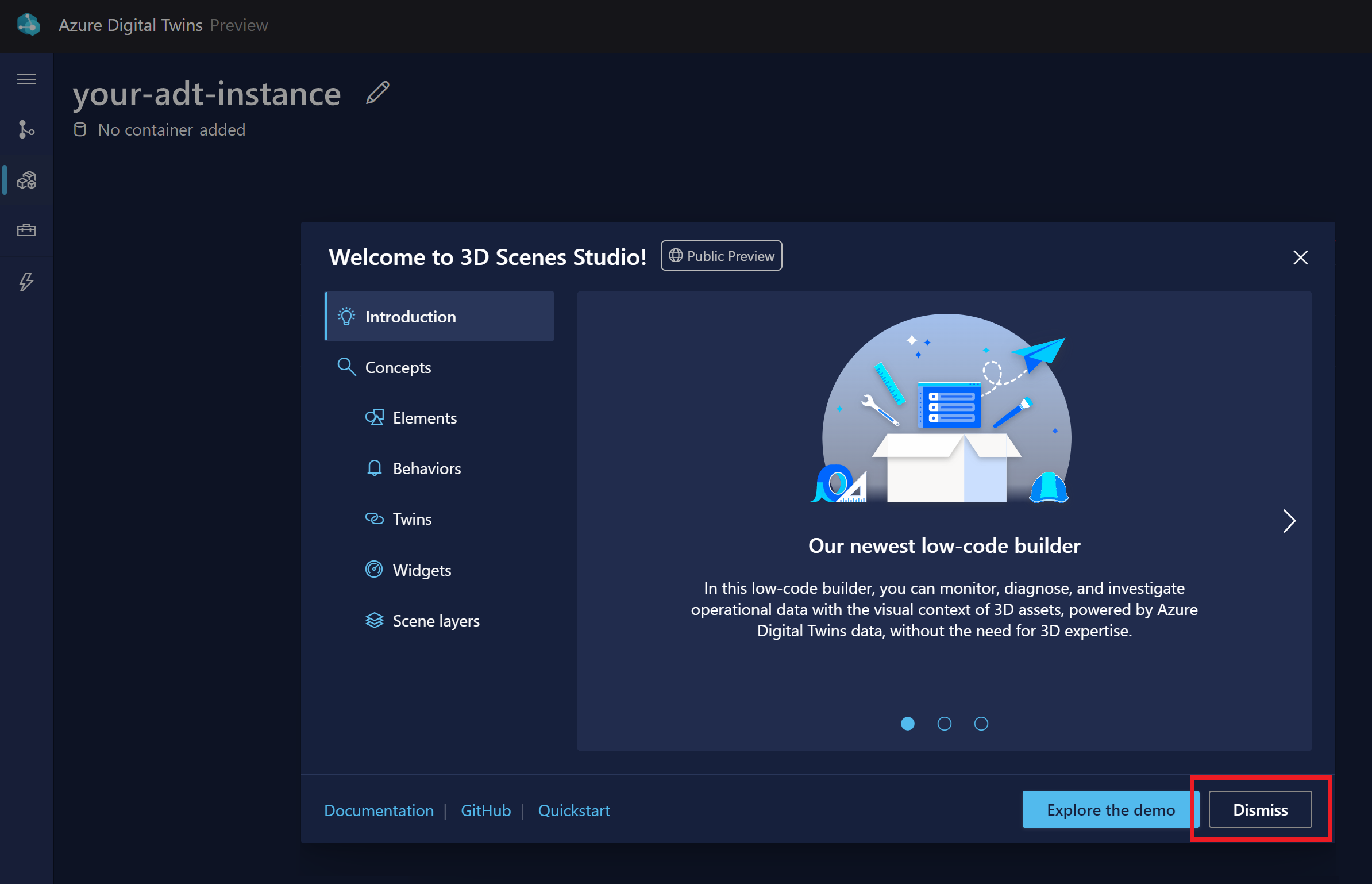 Navigate to the 3D Scenes Studio. The studio opens, connected to the Azure Digital Twins instance that you accessed last in the Azure Digital Twins Explorer. Dismiss the welcome demo.