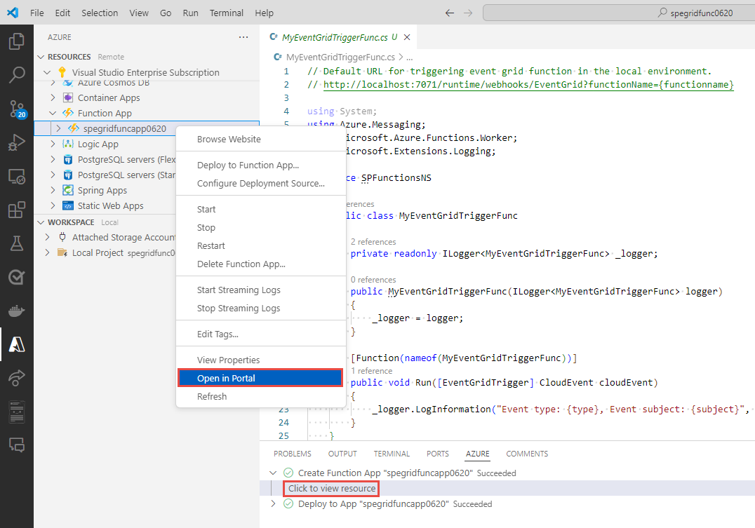In this section, you use Visual Studio Code to create a function with an Event Grid trigger.