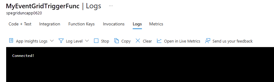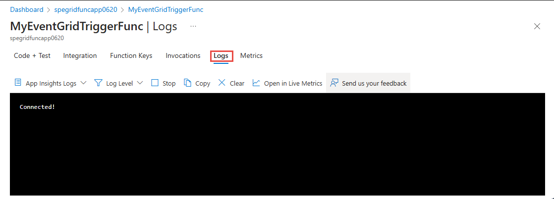 Switch to the Logs tab. Keep this tab open so that you can see logged messages when you send an event to an Event Grid topic later in this article.
