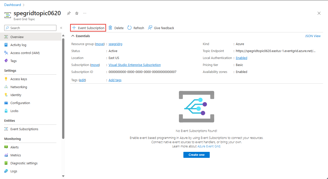 On the Event Grid Topic page for your custom topic, select + Event Subscription on the toolbar.