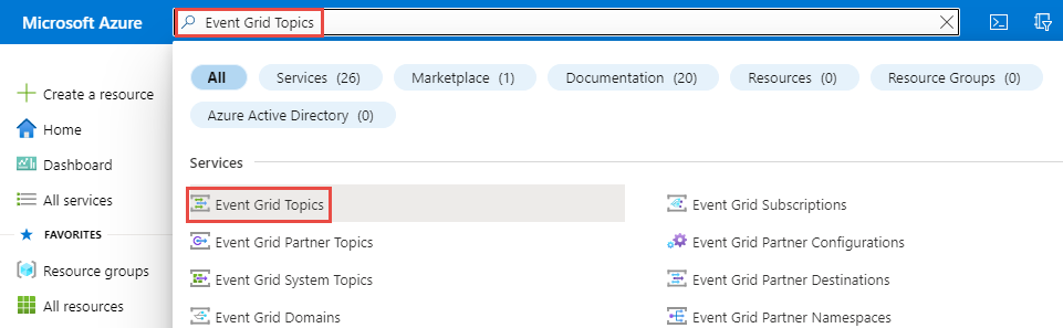 On the search bar at the topic, search for Event Grid Topics, and then select Event Grid Topics.