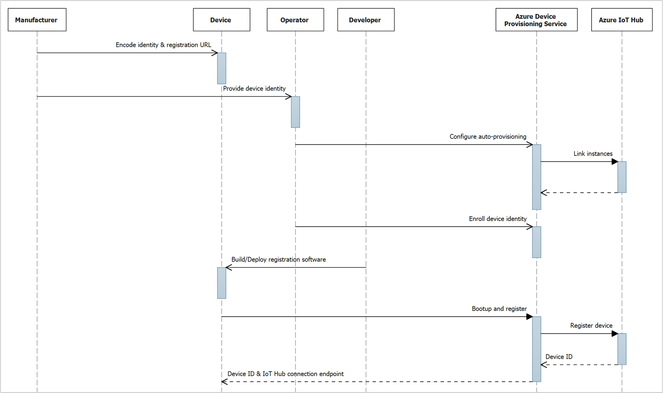 | Provide device identity | As the originator of the device identity info, the manufacturer is responsible for communicating it to the operator (or a designated agent), or directly enrolling it to the Device Provisioning Service via APIs. Quickstarts: since the device is simulated, there's no Manufacturer role. See the Operator role for details on how you get the device identity, which is used to enroll a simulated device in your Device Provisioning Service instance. |