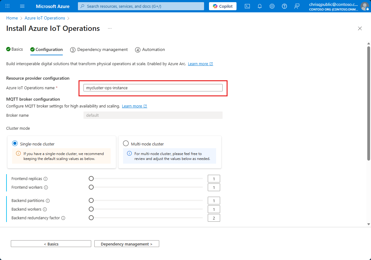 Parameter Value Azure IoT Operations name Optional: Replace the default name for the Azure IoT Operations instance. MQTT broker configuration Optional: Edit the default settings for the MQTT broker. In Azure portal it's possible to configure cardinality and memory profile settings. The backend redundancy factor must be set to 2 or greater for high availability and upgrade support. To configure other settings including disk-backed message buffer and advanced MQTT client options, see Azure CLI support for advanced MQTT broker configuration. Data flow profile configuration Optional: Edit the default settings for data flows. For more information, see Configure data flow profile. Select Next: Dependency management.