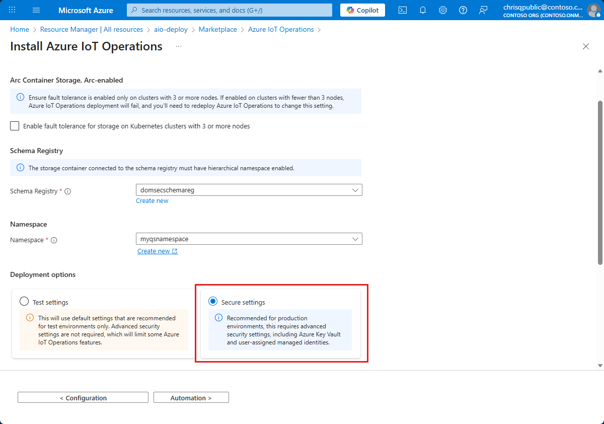 Learn how to deploy Azure IoT Operations to a Kubernetes cluster with secure settings for production using the Azure portal.