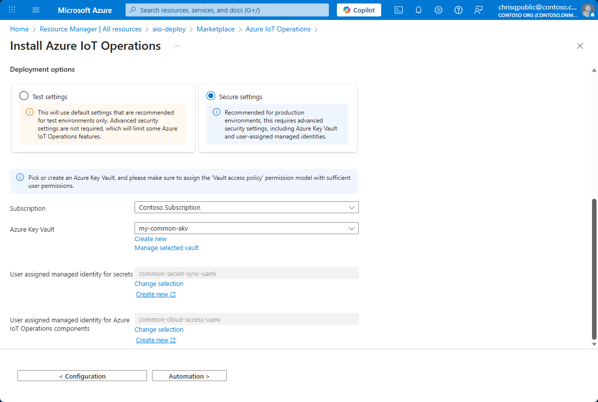 Ensure to give your user account permissions to manage secrets with theKey Vault Secrets Officerrole.User assigned managed identity for secrets Select an identity or select Create new. User assigned managed identity for AIO components Select an identity or select Create new. Don't use the same managed identity as the one you selected for secrets. Select Next: Automation.