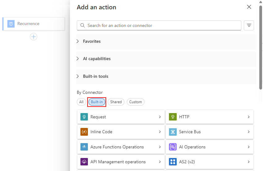 - Custom: Any connectors with actions that you created and installed.The following example shows the workflow designer with the opened Add an action pane and the selected Built-in option. The list shows the available operation collections, which appear in a specific order.