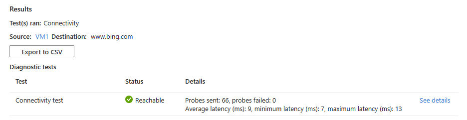 - 66 probes were successfully sent to the destination virtual machine. Select See details to see the next hop details.