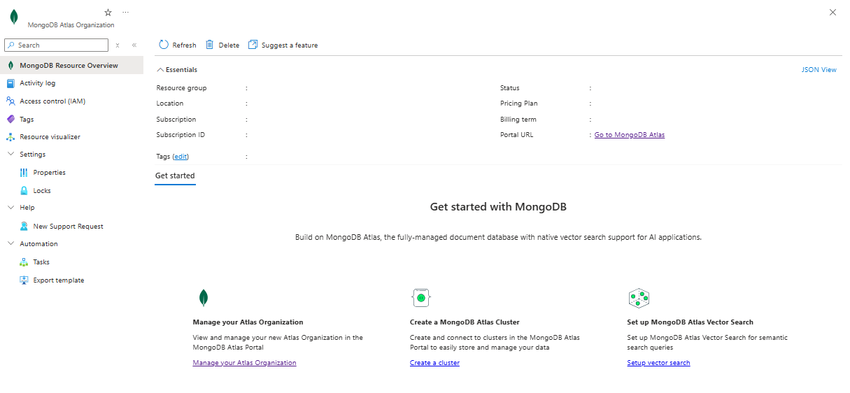 Following these steps deletes your MongoDB Atlas Azure resource, but doesn't delete the organization in Atlas. To learn how to delete your Atlas organization, see Delete an organization in MongoDB's documentation.