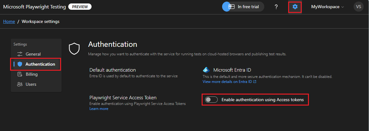 Microsoft Entra ID uses your Azure credentials, requiring a sign-in to your Azure account for secure access. Alternatively, you can generate an access token from your Playwright workspace and use it in your setup. However, we strongly recommend Microsoft Entra ID for authentication due to its enhanced security. Access tokens, while convenient, function like long-lived passwords and are more susceptible to being compromised.