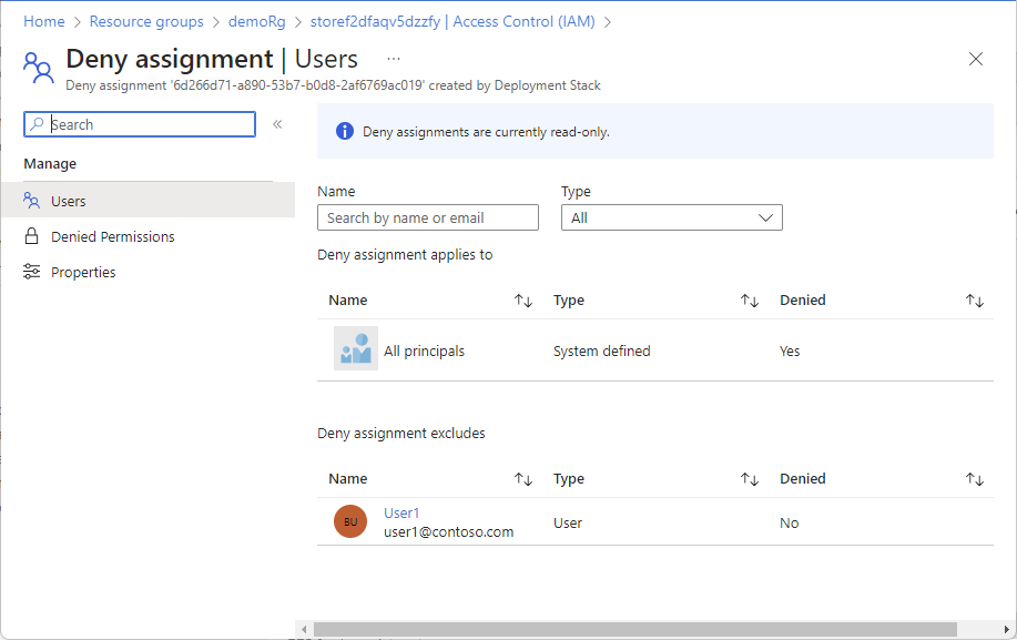 Deny setting Description Deny assignment applies to Security principals that the deny assignment applies to. Deny assignment excludes Security principals that are excluded from the deny assignment. System-Defined Principal represents all users, groups, service principals, and managed identities in an Azure AD directory.