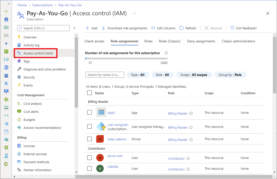 In the Azure portal, role assignments using Azure RBAC appear on the Access control (IAM) page. This page can be found throughout the portal, such as management groups, subscriptions, resource groups, and various resources.