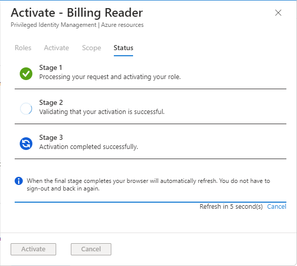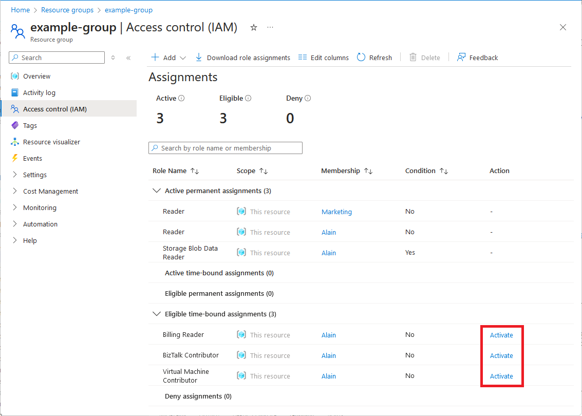 Once an eligible role assignment has been activated, it will be listed as an active time-bound role assignment on the Check access and Role assignments tabs. For more information, see List Azure role assignments using the Azure portal.