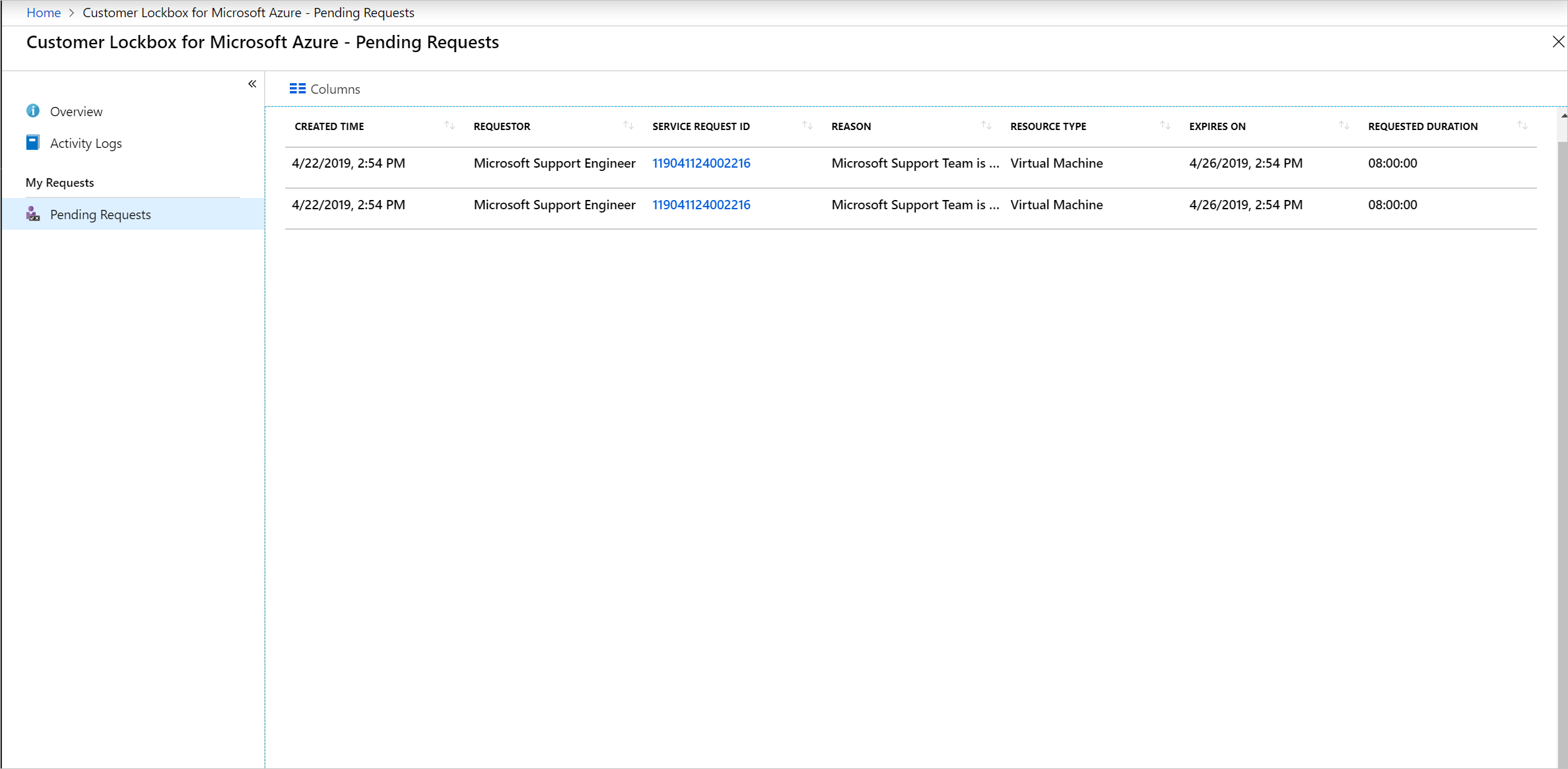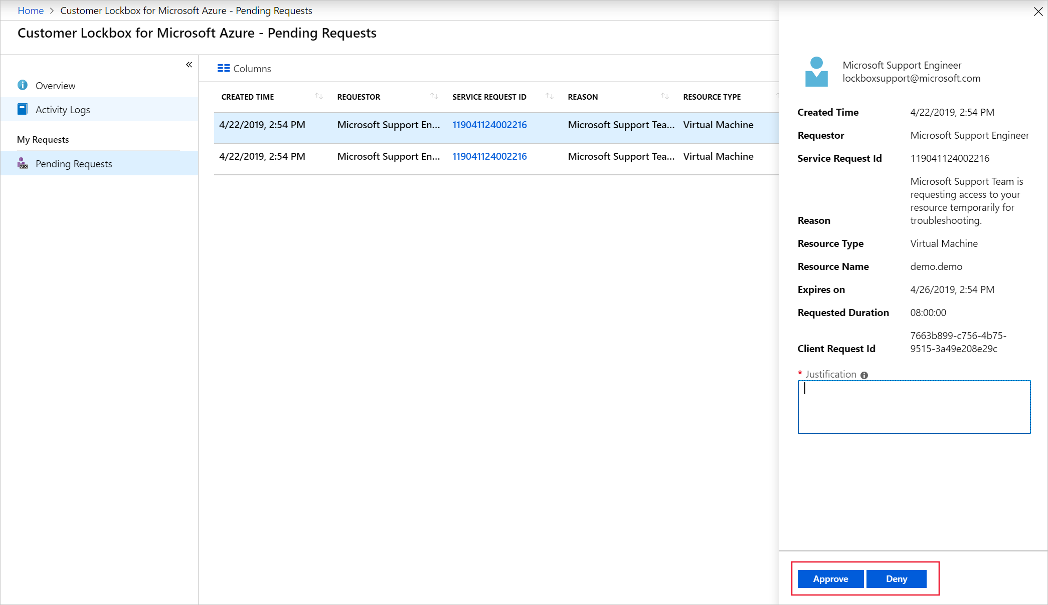 The request remains in the customer queue for four days. After this time, the access request automatically expires and no access is granted to Microsoft engineers.To get the details of the pending request, the designated approver can select the Customer Lockbox request from Pending Requests: