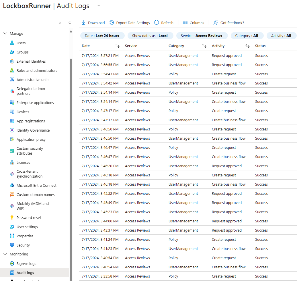 For tenant-scoped Customer Lockbox requests, log entries are written to the Entra Audit Log. These Log entries are created by the Access Reviews service with activities such as: