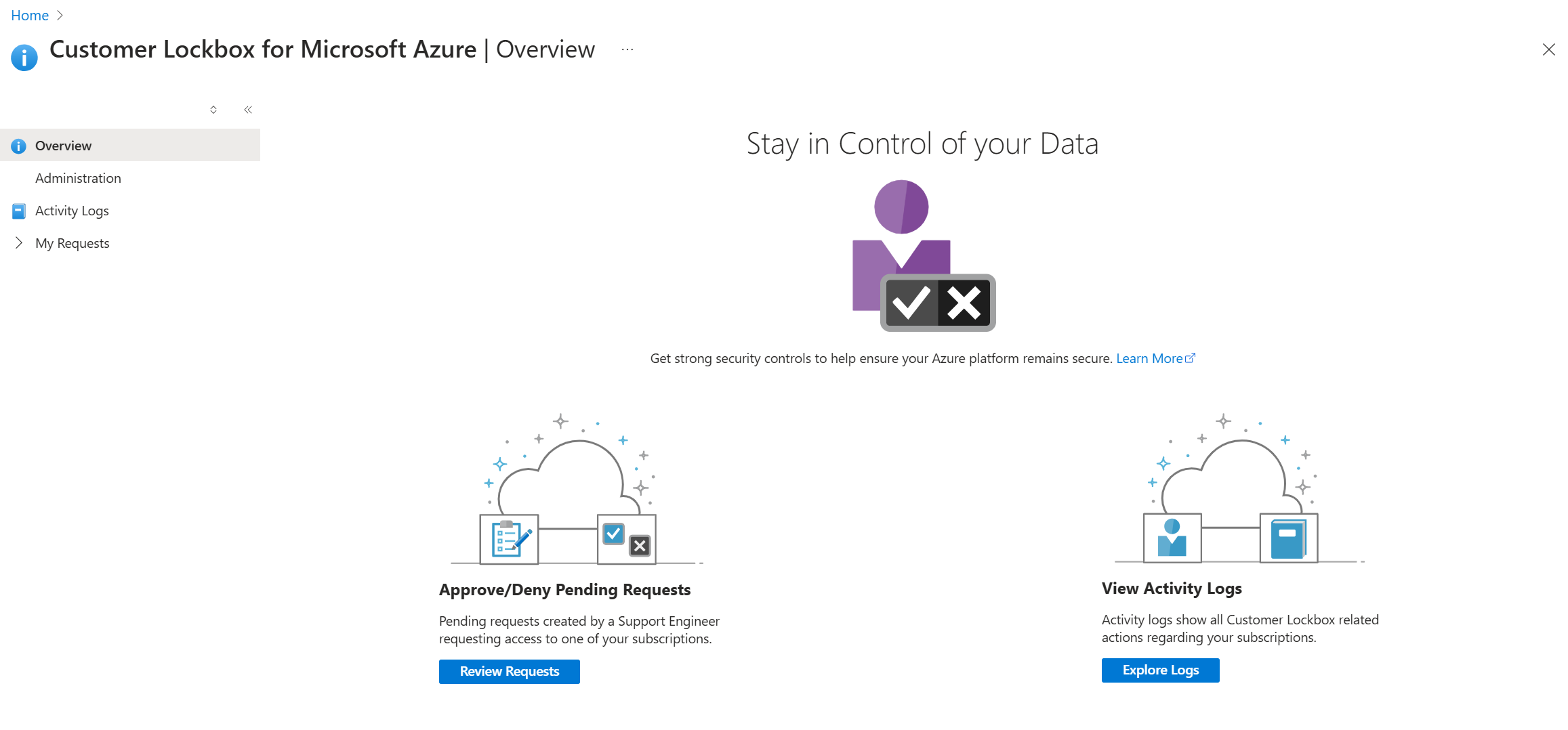 Enable Customer Lockbox from the Administration module in the Customer Lockbox blade. Customer Lockbox for Microsoft Azure is available for all customers who have an Azure support plan with a minimal level of Developer.